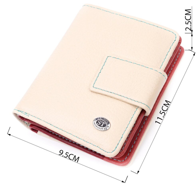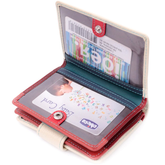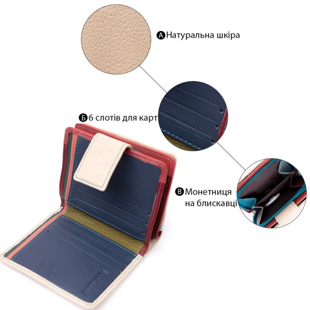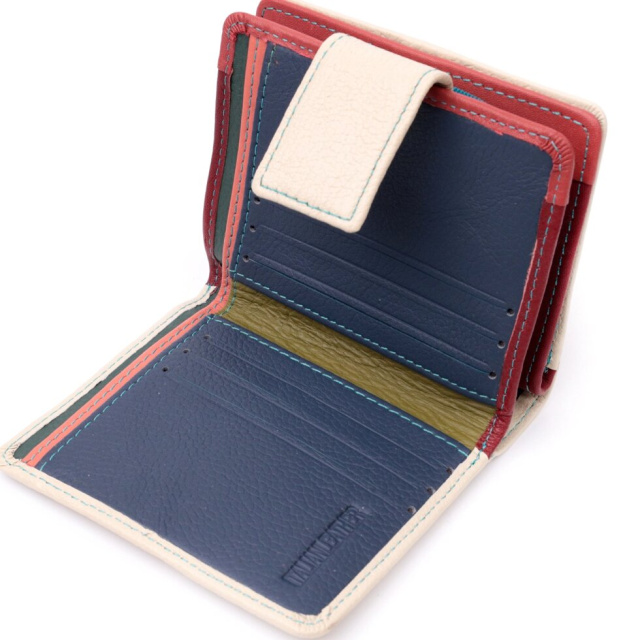 Красиве портмоне в два складання компактного розміру з натуральної шкіри найвищої якості. Гаманець кремово-білого кольору зовні та різнобарвний усередині, що дуже стильно та сучасно. Шкіряне портмоне дуже практичне і служить досить довго. Аксесуар складається з двох містких кишень для купюр, кишені на блискавці для монет, шести осередків для карт, двох прозорих віконець для перепусток або фотографій та двох прихованих кишень. Портмоне доповнено надійною фурнітурою і прошито по краю рівним рядком бірюзового кольору. Укомплектований гаманець у фірмову картонну коробку білого кольору. Виріб стане ідеальним подарунком для дівчини будь-якого віку.