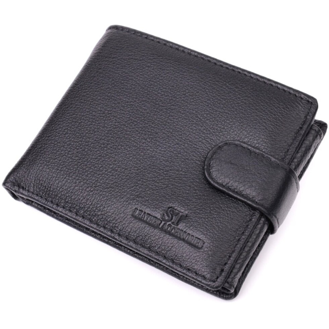 Багатофункціональний гаманець для ділових чоловіків, які цінують якість і практичність. Аксесуар місткий із натуральної шкіри, він складається з двох містких відділень для купюр, двох кишень на блискавках, чотирьох кишень під плівкою, які знаходяться в одному блоці і закриваються хлястиком на кнопку, трьох осередків для карт, двох прихованих кишень та кишені для монет. Портмоне доповнено надійною фурнітурою та міцною підкладкою. Запакований гаманець у фірмову картонну коробку білого кольору.