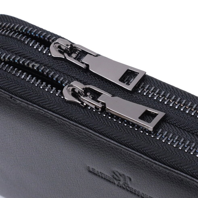 Зручний чоловічий клатч у класичному стилі із натуральної шкіри. Для максимальної зручності гаманець розділений на два великі відділення, що закриваються на блискавці. Аксесуар має все необхідне, щоб стати Вам незамінним помічником у повсякденному житті. Ви легко помістите в нього паперові купюри, монети, документи, картки і навіть смартфон. На лицьовій стороні вгорі посередині розташоване тиснення з логотипом виробника, що є запорукою якості виробу. Запакований аксесуар у білу щільну картонну коробку з фірмовим логотипом.