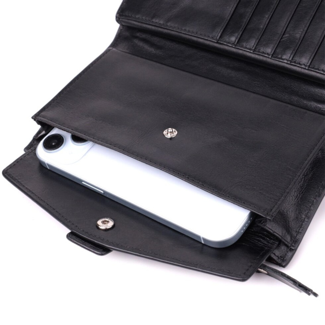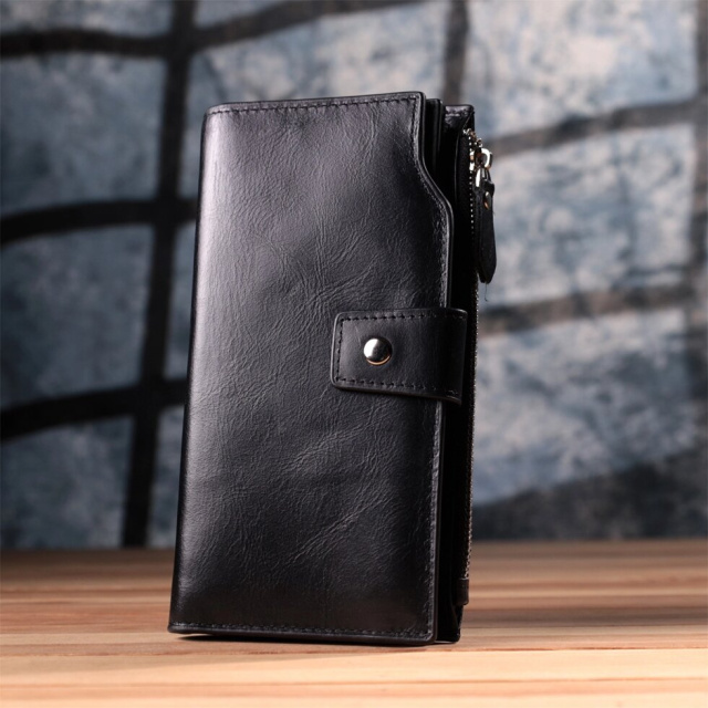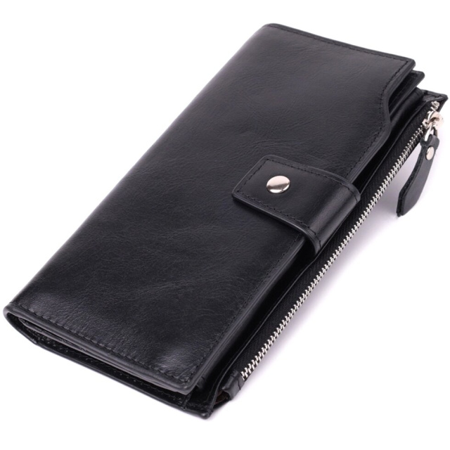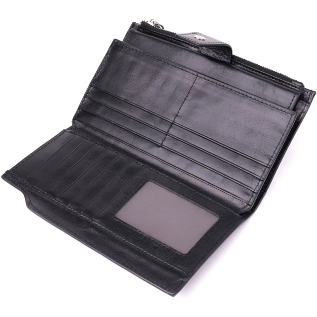 Універсальне портмоне як для чоловіка, так і для жінки у класичному чорному кольорі з невимушеним дизайном. Аксесуар виготовлений з якісної натуральної шкіри, яка має вишуканий блиск і приємна на дотик. Тонкий і м'який на дотик гаманець має більш ніж достатньо осередків для кредиток, кишеньок для монет та відділення для купюр. Аксесуар дуже стильний і доповнений найнеобхіднішим функціоналом без зайвих деталей. Це портмоне, ідеальне поєднання практичності та витонченого стилю, що підкреслює Ваш смак та увагу до деталей.