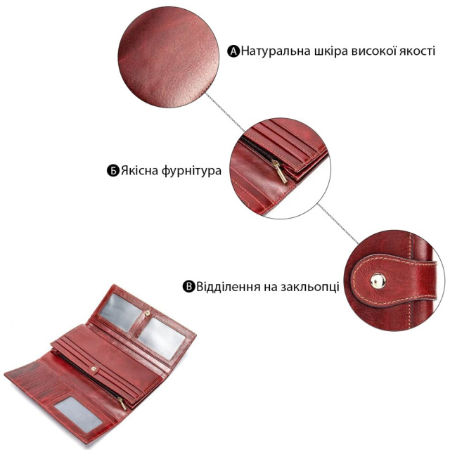 Стильний і місткий жіночий гаманець. У такій моделі багато місця для ваших кредиток і ви без проблем зможете помістити чималу кількість купюр і монет. Гаманець досить об'ємний. Гаманець прошитий по краях акуратно рудим рядком. Аксесуар виконаний з урахуванням всіх модних тенденцій і побажань клієнтів. Аксесуар виготовлений з щільної натуральної шкіри приємною на дотик. Бордовий колір - це ідеальне поєднання розкоші і класики.