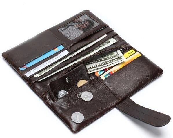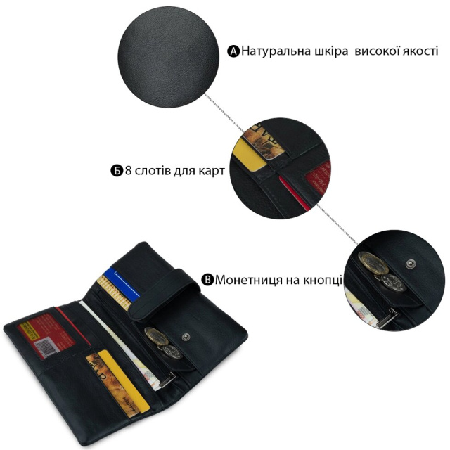 Всередині аксесуар шкіряний в поєднанні з текстилем. Місткий вертикальний гаманець спокійно поміститься в вашу сумку і відмінно підійде до вашого образу. Дизайн гаманця виготовлений в класичному стилі і продуманий до дрібниць для вашої зручності. Гаманець доповнений різноманітними кишенями, щоб ваші речі не плуталися і не заважали. По краях аксесуар прошитий чорним рядком в тонах аксесуара.