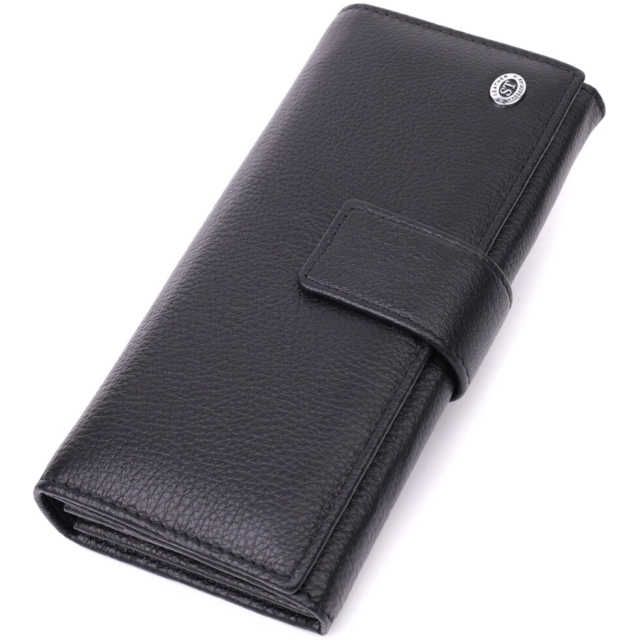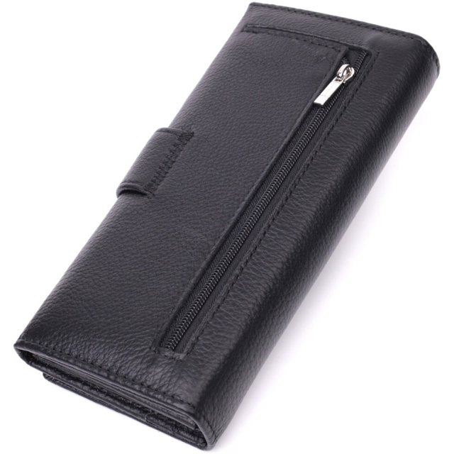 Модне жіноче портмоне вертикального типу, що закривається навпіл хлястиком на кнопку. Модель пошита з якісної шкіри, яка чудово проявила себе у довгостроковій експлуатації. Аксесуар складається з чотирьох відділень для купюр, двох кишень на блискавці, чотирнадцяти осередків для пластикових карток, двох прилеглих кишень та монетниці зовні. Модель упакована в коробочку, що дуже зручно, якщо виріб призначений для подарунка.