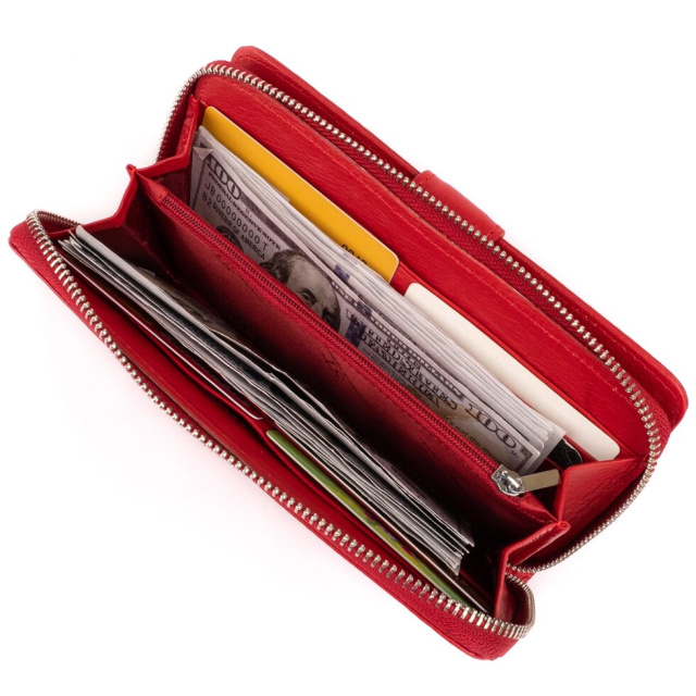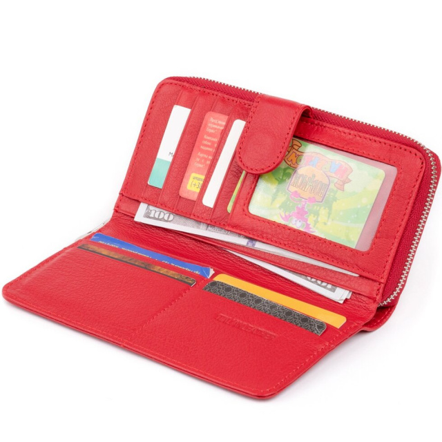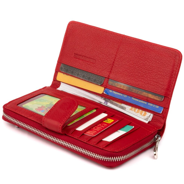 Місткий аксесуар з натуральної шкіри яскравого червоного кольору. Виріб підійде для дівчат, які люблять яскраві аксесуари. Впевнені, що даний гаманець не залишиться без уваги і отримає багато компліментів у свою адресу. Функціонал гаманця виражений достатньою кількістю слотів для кредиток і відділень для купюр в розгорнутому вигляді. Даний гаманець зручно лежить в руці. М'яка і приємна шкіра прослужить вам далеко не один рік. По краях аксесуар прошитий рівним рядком. На лицьовій стороні гаманця металевий логотип бренду. Внутрішнє оздоблення: поєднання міцного текстилю та натуральної шкіри. На нашому сайті аксесуар доступний в різних кольорах. Замовляйте даний аксесуар на нашому сайті за найдоступнішою ціною.