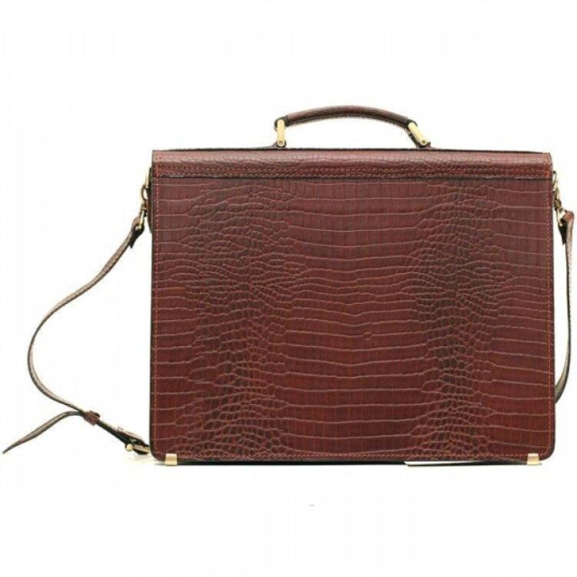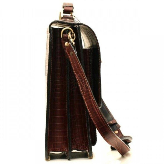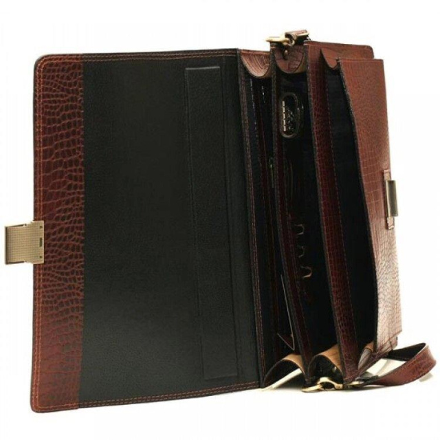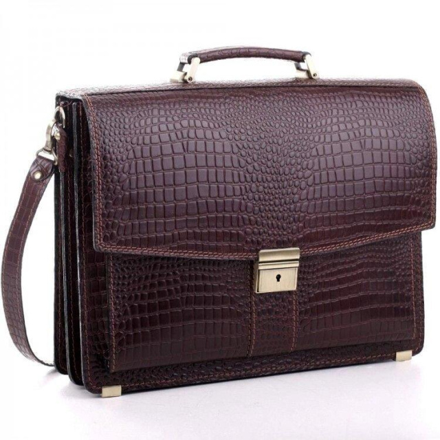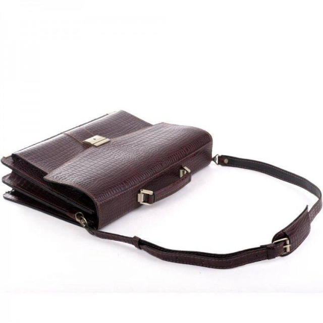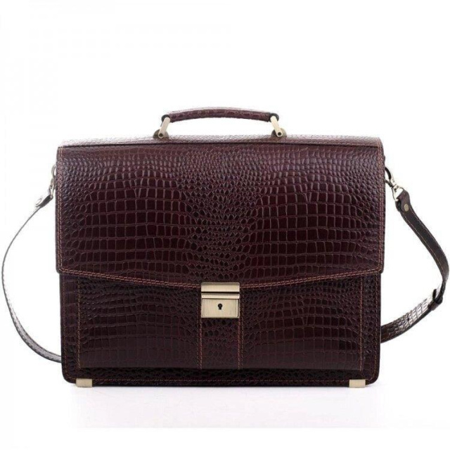 Коричневий респектабельний портфель із ТЕЛЯЧОЇ натуральної шкіри з фактурою шкіра крокодила.